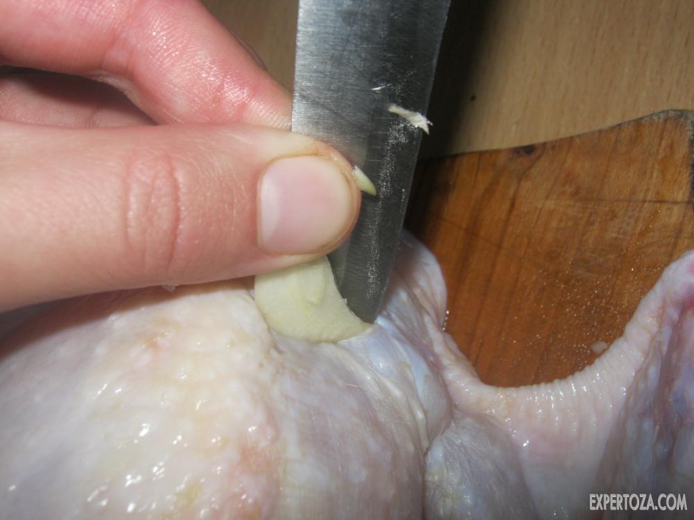 4. По всей курице делаем ножом небольшие надрезы, которые надо заполнить чесноком.