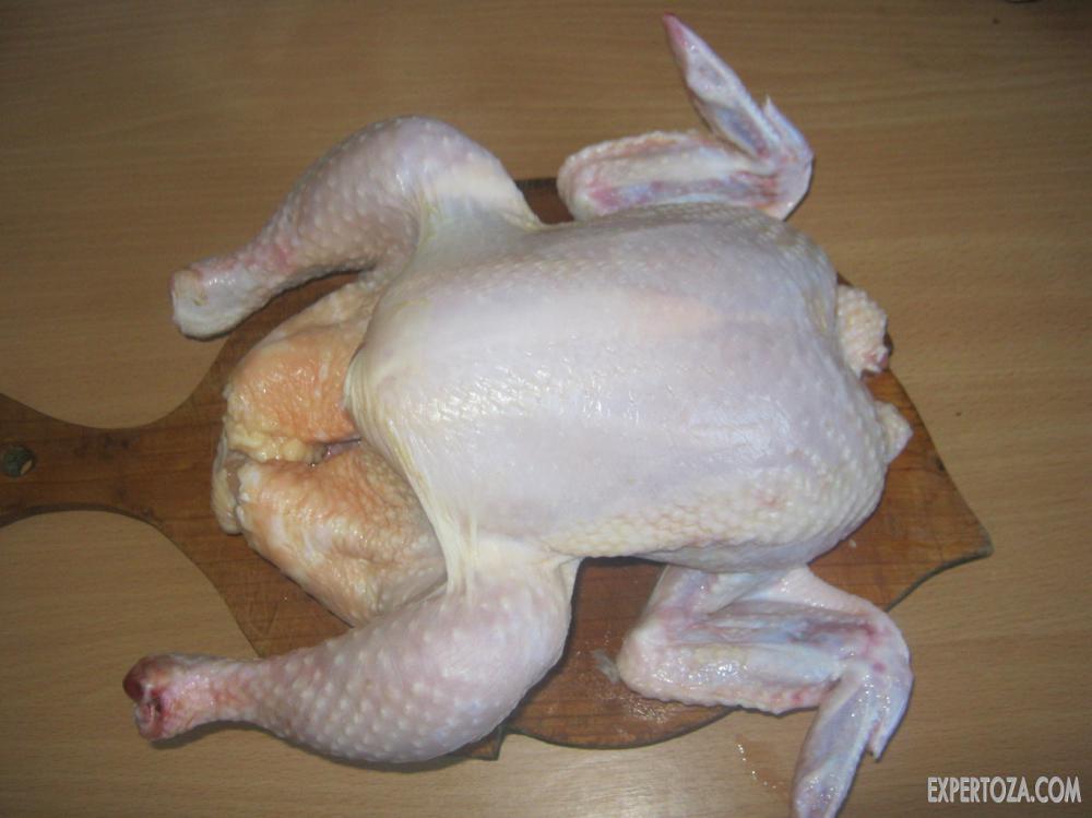 Берется молодое куриное мясо, из которого предварительно удаляются внутренности, и разделяется на две половинки по хребту.