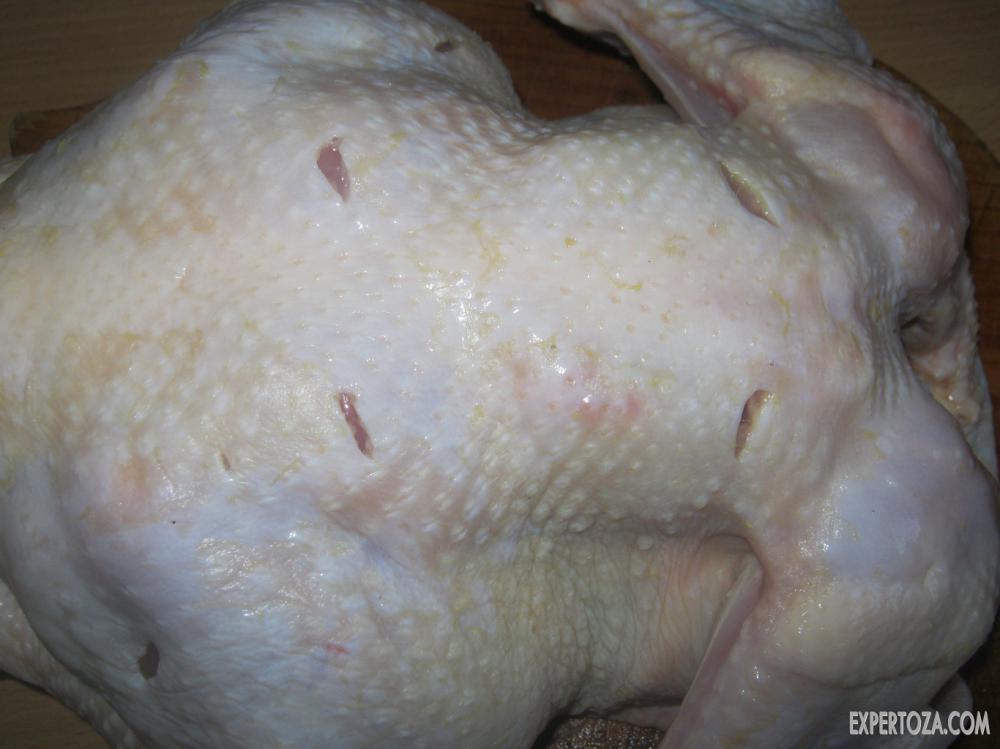 1. Разрежьте ножом вдоль грудку курицы, сделая вот такое отверстие. Затем возьмите вилку и проткните ею голени, сделайте это в нескольких местах.