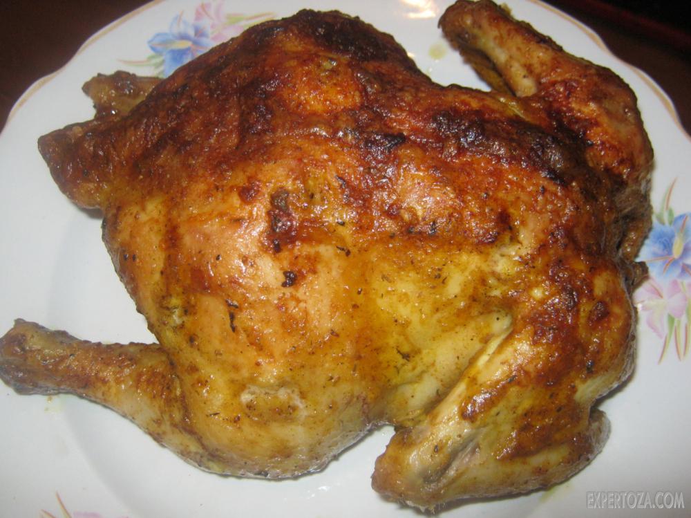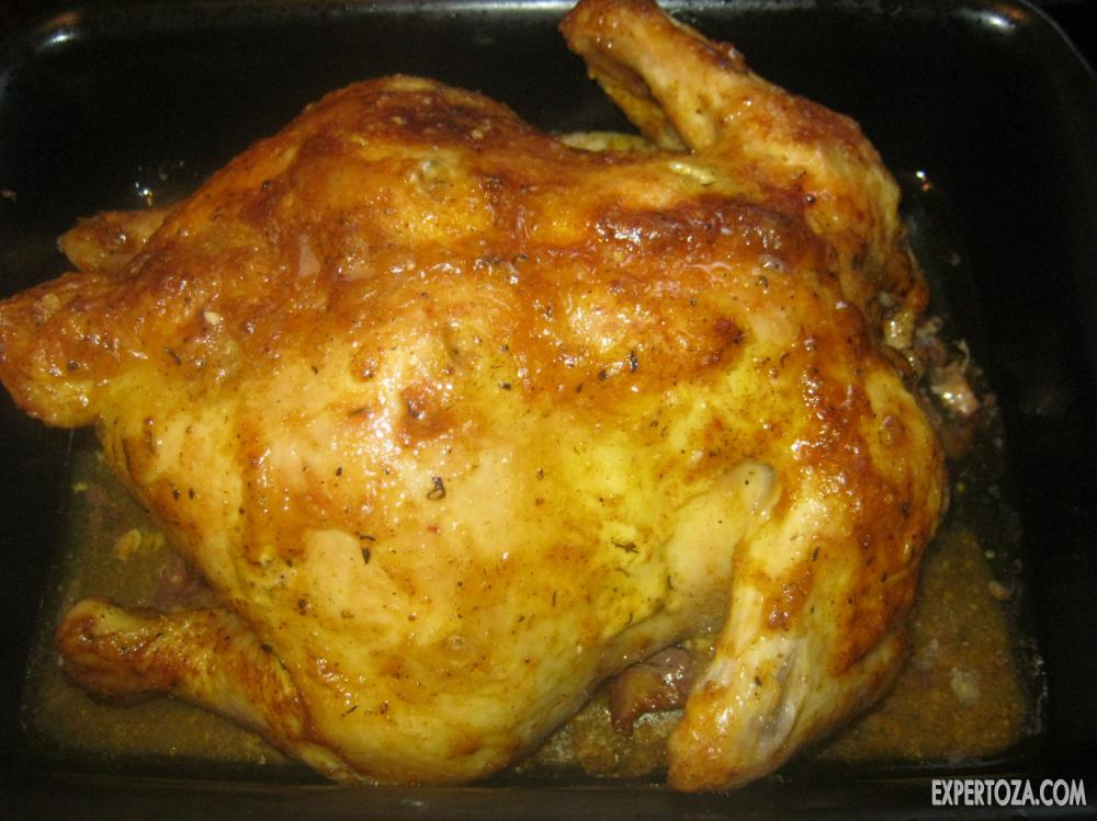 Считается одним из самых простых рецептов. Курочку промываем холодной водой и натираем смесью из соли и специй, при желании ее можно нашпиговать чесноком, после чего помещаем в предварительно разогретую духовку. Когда курочка начнет подрумяниваться — снижаем температуру и смазываем тушку растительным или сливочным маслом.