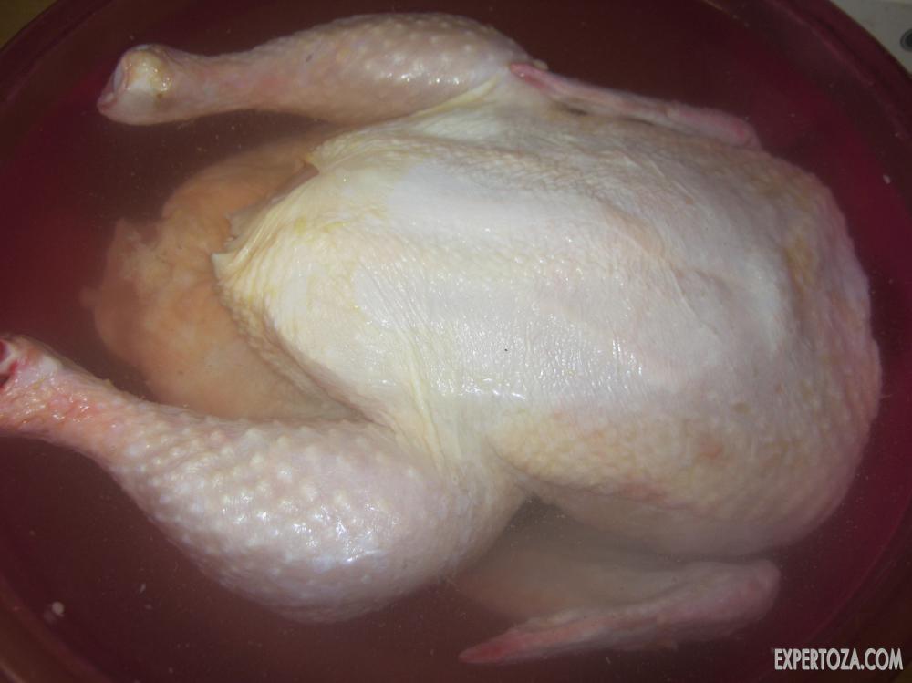 1. Первым делом курицу необходимо подготовить к процессу запекания — удалить все лишнее, если такое имеется, и хорошенько промыть в холодной воде. И вот первый секрет — для того, чтобы курица получилась в результате сочной и нежной, перед запеканием ее необходимо замочить в растворе соли (полстакана соли на 2 литра воды) и отправить в холодильник минимум на час, а максимум на 4-5 часов. Эта процедура не обязательная, но если у вас позволяет время, то не поленитесь замочить курицу, и результат обязательно порадует — мясо и правда получается более мягким и сочным. Я замачивала свою курочку примерно на 3 час