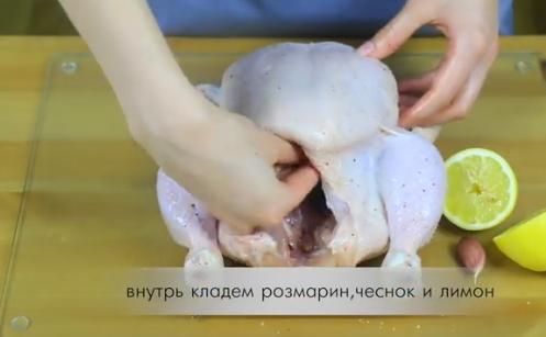 2. Добавьте молотый перец и разотрите его по всей поверхности куриного мяса. А после присолите все части тушки. Во внутрь положите веточку розмарина, очищенные дольки чеснока и лимон. Лимон предварительно разрежьте на две половинки.