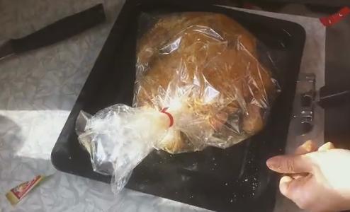 4. Поместите в рукав для запекания, края завяжите. Теперь в заранее подогретую духовку до 180 градусов поместите тушку и выпекайте 1 -1,5 часа. Приятного аппетита!