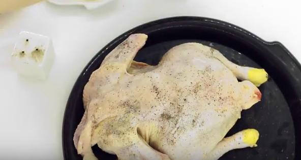 - Натираем курицу изнутри и снаружи солью и перцем. Укладываем тушку в чугунную сковороду, противень или форму для запекания.