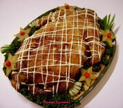 4. А после переместите тушку на стеклянный листик смазанный любым маслом, можно даже взять оливковое. Выпекайте при температуре 180 — 200 градусов примерно 1-1,5 часа.