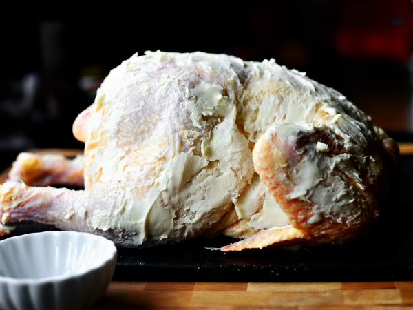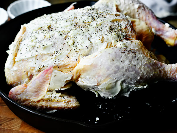 - Мягкое масло кладём сверху на курицу и руками растираем его по всей тушке. Чем мягче масло, тем проще покрыть ним тушку. Поэтому также важно, чтобы курица была незамороженной, иначе масло при контакте с холодной куриной кожей начнёт твердеть, что значительно усложнит задачу. Не лишним будет помыть руки тёплой водой перед началом процедуры.