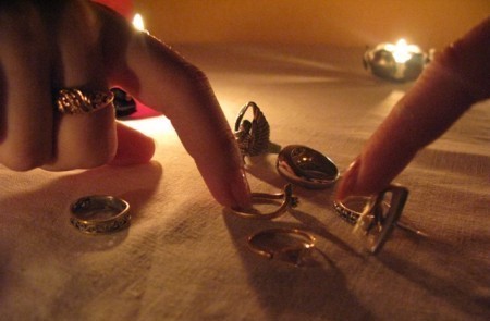 На куске черного бархата по очереди катали гладкое золотое кольцо со словами: «Я колечко покачу вокруг города! Оно меня к милому и приведет». Каждая делала отметку мелом в месте, где оно остановилось. У кого дальше укатилось — готовиться к свадьбе. Если кольцо укатилось за пределы материала — девушка не выйдет замуж. - 3.