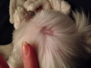 . Для этого шерсть вокруг поражённого участка аккуратно выстригается, захватывая один сантиметр вокруг него. Не нужно выбривать шерсть, это может привести к ранению повреждённого участка и инфицированию раны.