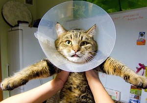 . Если кошка или собака отличается крупными размерами и пытается избавиться от воротника или намордника, можно дать им седативный препарат, который немного их успокоит.