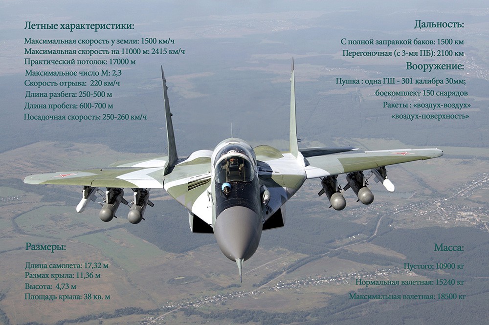 Фронтовой истребитель МиГ-29 получил двигатели РД-33 общей тягой более 16 тысяч килограмм. Максимальная скорость самолета — 2450 километров в час, продолжительность полета до 2,5 часа. Истребитель снабжен защитными решетками воздухозаборников и прочным шасси, что позволяет использовать короткие и малоподготовленные взлетно-посадочные полосы.