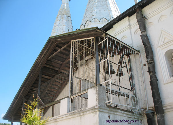 Рядом со входом на возвышении есть звонница с небольшими колоколами.