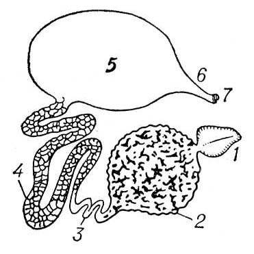Пищеварительная система имеет достаточно непростое строение. Из ротового отверстия пища попадает в глотку, далее – в пищевод, после чего – в желудок, который имеет два отдела. Оба отдела желудка работают слаженно: