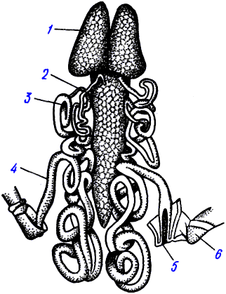 артерии; 7 — жабры; 8 — яичник; 9 — брюшная