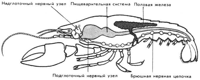 Кожномускульный мешочек, который свойственен червям, у рака заменен мускулами, которые образуют самостоятельные мышечные пучки, приводящие в движение различные члены. В тельце находятся различные органы.
