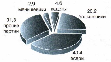 Но к этому времени власть уже оказалась в руках большевиков. Большевики обещали, что подчинятся воле Собрания, и надеялись победить, убедив большинство в своей правоте с помощью первых популистских мер Совета народных комиссаров. Выборы в Учредительное собрание, официально проходившие 12 ноября (отдельные депутаты были избраны в октябре-феврале) принесли большевикам разочарование – они набрали 23,5% голосов и 180 депутатских мандатов из 767. А партии сторонников демократического социализма (эсеры, социал-демократы меньшевики и др.) получили 58,1%. Крестьянство отдало свои голоса эсерам, и они сформировали крупнейшую фракцию в 352 депутата. Ещё 128 мест получили другие социалистические партии. В крупных городах и на фронте большевики добились больших успехов, но Россия была преимущественно крестьянской страной. Союзники большевиков, отколовшиеся от партии эсеров левые эсеры, прошедшие по спискам ПСР, получили только около 40 мандатов, то есть около 5%, и не могли переломить ситуацию. В тех округах, где левые эсеры решились идти самостоятельно, они в большинстве случаев потерпели поражение.