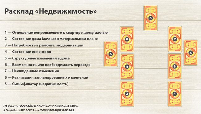 Расклад на недвижимость Таро рекомендуется использовать в том случае, когда человек сомневается в правильности своего выбора и не может остановиться на предложенных вариантах в случае покупки, обмена, продажи или аренды. Каковы возможности осуществления планов, где находятся точки напряжения.