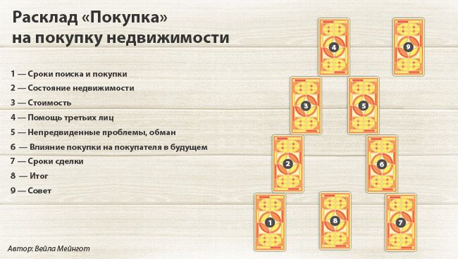 С помощью данного расклада вы узнаете о физическом, энергетическом состоянии недвижимости, соседях, условиях окружающей среды, а также то, как эта покупка повлияет на вашу жизнь.
