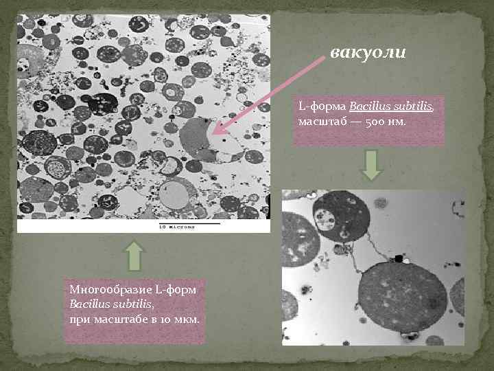 вакуоли L-форма Bacillus subtilis, масштаб — 500 нм. Многообразие L-форм Bacillus subtilis, при масштабе в 10 мкм.