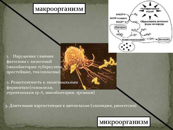макроорганизм 1. Нарушение слияния фагосомы с лизосомой (микобактерии туберкулеза, простейшие, токсоплазмы) 2. Резистентность к лизосомальным ферментам (гонококки, стрептококки гр А, микобактерии, ерсинии) 3. Длительная персистенция в цитоплазме (хламидии, риккетсии) микроорганизм