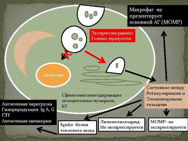 Макрофаг не презентирует основной АГ (MOMP) Экспрессия ранних Генных продуктов лизосома Антигенная перегрузка Гиперпродукция Ig A, G ГЗТ Антигенная мимикрия Сфингомиелинсодержащие экзоцитозные пузырьки, КГ hps 60 — белки теплового шока Липополисахарид. Не экспрессируется Состояние между Ретикулярными и Элементарными тельцами MOMP- не экспрессируется
