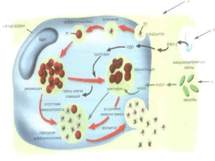 Медиаторы персистенции Chlamydia trachomatis Медиатор Эффект Низкие концентрации g -интерферона Резкое снижение количества эндогенного триптофана (активация фермента индоламин -2, 3 -диоксигеназы, расщепляющего триптофан до N-формилкинуренина) ФНО-a Дефицит эндогенного триптофана Опосредованный, путем активации b -ИФ (блокирует репродукцию внутриклеточных микроорганизмов, путем усиления экспрессии мембранных белков клеток) Необходим для построения МОМР Дефицит ц. ГМФ и высокое количество ц. АМФ Отсутствие активации ферментов необходимых для дифференциации РТ в ЭТ Дефицит и/или действие антагонистов Са 2+ Нарушение агрегации эндосомальных вакуолей