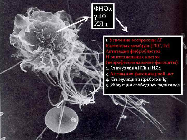 ФНОα γИФ ИЛ-1 1. Усиление экспрессии АГ Клеточных мембран (ГКС, Fc) Активация фибробластов И эпителиальных клеток (непрофессиональные фагоциты) 2. Стимуляция ИЛ 1 и ИЛ 2 3. Активация фагоцитарной акт 4. Стимуляция выработки Ig 5. Индукция свободных радикалов