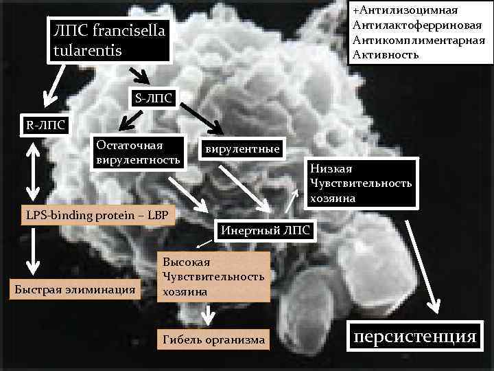+Антилизоцимная Антилактоферриновая Антикомплиментарная Активность ЛПС francisella tularentis S-ЛПС R-ЛПС Остаточная вирулентность вирулентные Низкая Чувствительность хозяина LPS-binding protein – LBP Инертный ЛПС Быстрая элиминация Высокая Чувствительность хозяина Гибель организма персистенция