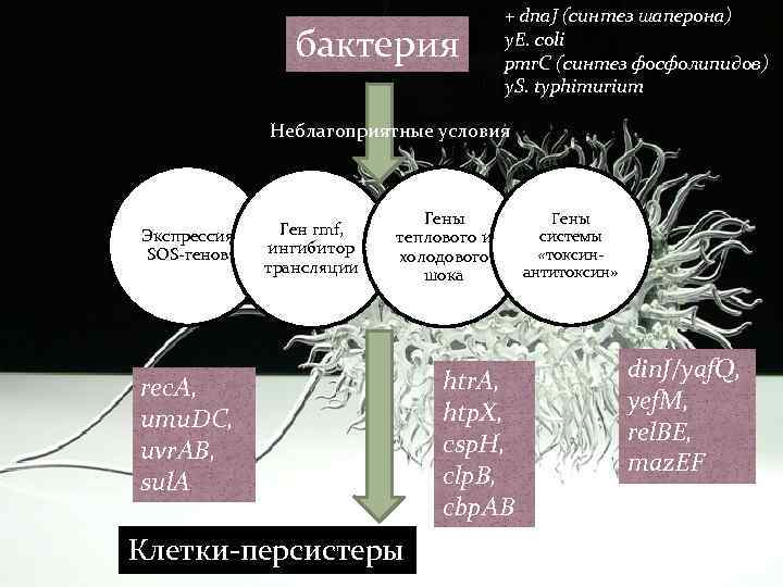 бактерия + dna. J (синтез шаперона) у. E. coli pmr. C (синтез фосфолипидов) у. S. typhimurium Неблагоприятные условия Экспрессия SOS-генов Ген rmf, ингибитор трансляции Гены теплового и холодового шока rec. A, umu. DC, uvr. AB, sul. A Клетки-персистеры htr. A, htp. X, csp. H, clp. B, cbp. AB Гены системы «токсинантитоксин» din. J/yaf. Q, yef. M, rel. BE, maz. EF