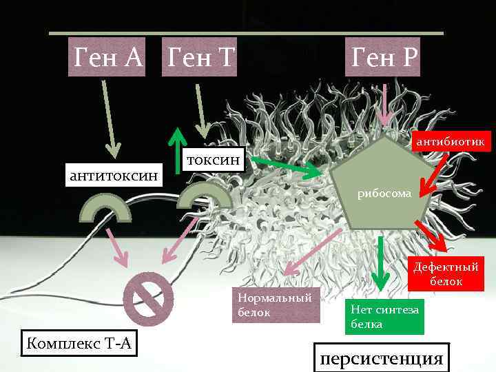 Ген А Ген Т Ген Р антибиотик антитоксин рибосома Дефектный белок Нормальный белок Комплекс Т-А Нет синтеза белка персистенция