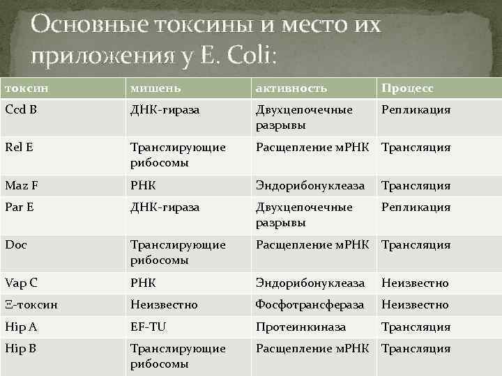 Основные токсины и место их приложения у E. Coli: токсин мишень активность Процесс Ccd B ДНК-гираза Двухцепочечные разрывы Репликация Rel E Транслирующие рибосомы Расщепление м. РНК Трансляция Maz F РНК Эндорибонуклеаза Трансляция Par E ДНК-гираза Двухцепочечные разрывы Репликация Doc Транслирующие рибосомы Расщепление м. РНК Трансляция Vap C РНК Эндорибонуклеаза Неизвестно Ξ-токсин Неизвестно Фосфотрансфераза Неизвестно Hip A EF-TU Протеинкиназа Трансляция Hip B Транслирующие рибосомы Расщепление м. РНК Трансляция