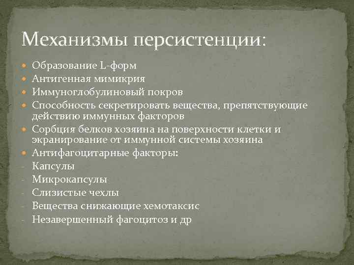 Механизмы персистенции: — Образование L-форм Антигенная мимикрия Иммуноглобулиновый покров Способность секретировать вещества, препятствующие действию иммунных факторов Сорбция белков хозяина на поверхности клетки и экранирование от иммунной системы хозяина Антифагоцитарные факторы: Капсулы Микрокапсулы Слизистые чехлы Вещества снижающие хемотаксис Незавершенный фагоцитоз и др