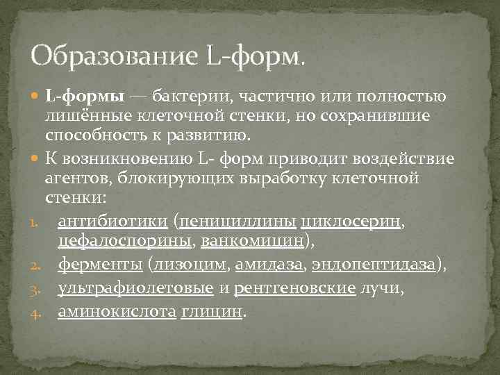 Образование L-формы — бактерии, частично или полностью лишённые клеточной стенки, но сохранившие способность к развитию. К возникновению L- форм приводит воздействие агентов, блокирующих выработку клеточной стенки: 1. антибиотики (пенициллины циклосерин, цефалоспорины, ванкомицин), 2. ферменты (лизоцим, амидаза, эндопептидаза), 3. ультрафиолетовые и рентгеновские лучи, 4. аминокислота глицин.