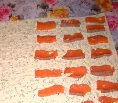 Если времени на готовку совсем немного, а гостей хочется удивить необычным закусочным аперитивом, то понадобится небольшое количество малосольного форелевого филе и мягкий плавленый сыр типа «Сливочный».