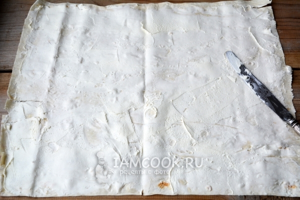 - Внешнюю часть «конвертика» можно для сочности и образования румяной корочки густо намазать армянским мацони, или более привычным для нас кефиром.