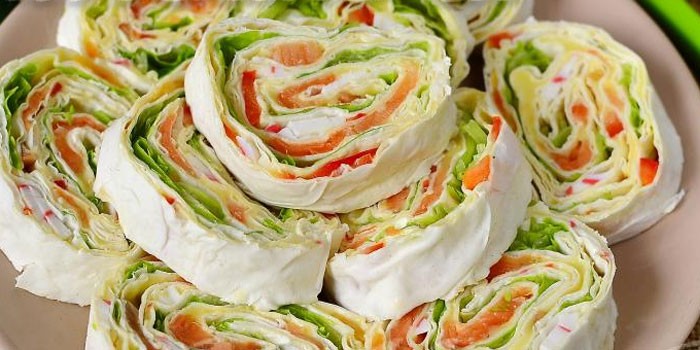 Есть множество методов, как приготовить рулет с красной рыбкой и пресными лепешками. Можно добавить нежный сыр, сочные и яркие овощи, сытные крабовые палочки. Закуска отлично сочетается со сливочным маслом, майонезом, сметаной или кетчупом.