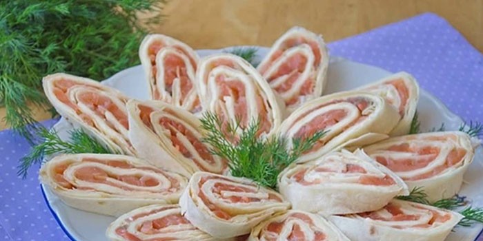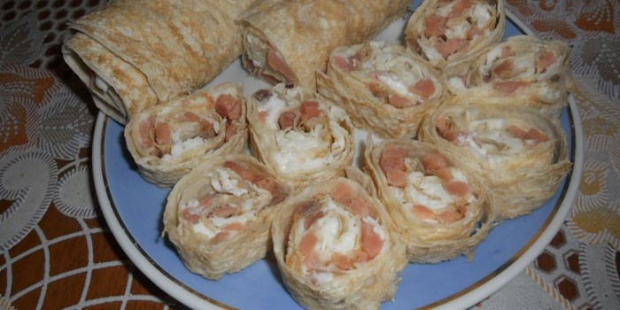 Закуска из лаваша с соленой форелью и сливочным сыром
