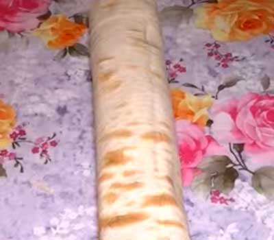 - Сделать большой рулет, плотно его завернув. Лаваш с горбушей запекать 1 час при 180°С.