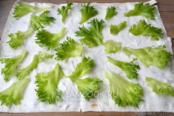 На сыр положите салатные листья. Я использовала салат фриллис. Листья этого салата плотные и хрустящие. Вы можете использовать любые салатные листья на ваш вкус.