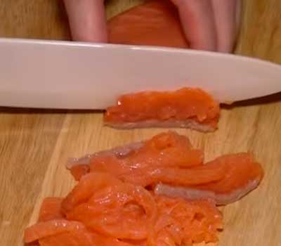 Рулетики из красной соленой рыбы проще всего сворачивать из нарезанного тонкими пластами филе. Для этого кусок должен быть достаточно крупным. Нарезать рыбу нужно очень острым ножом, держа его под небольшим углом.