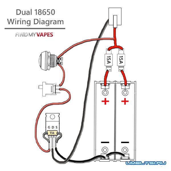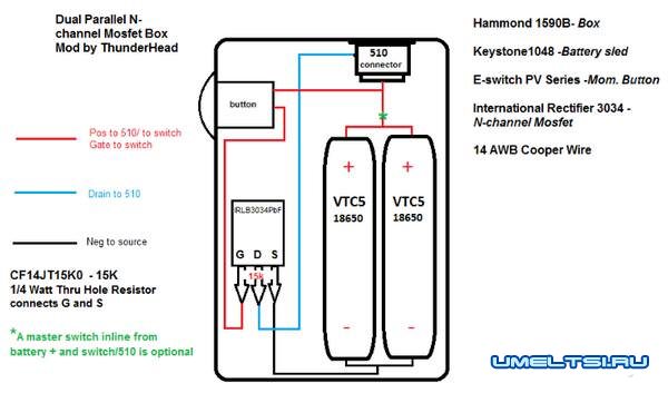 На этой картинке представлена отличная схема, на ней показано, как выглядит электронная сигарета своими руками изнутри. Главное для этого обладать проводами калибра 14 AWG Copper wire, 510-ым коннектором, мосфетом, кнопкой и отсеком для аккумуляторов. Все эти предметы можно купить в магазине радиодеталей или заказать в интернете. Самым дорогостоящим же в этой конструкции окажется покупка двух высокотоковых аккумуляторов. Вам подойдут аккумуляторы формата 18650 не менее чем 20А. Например, Sony VTC5 или хотя бы Samsung 25R.