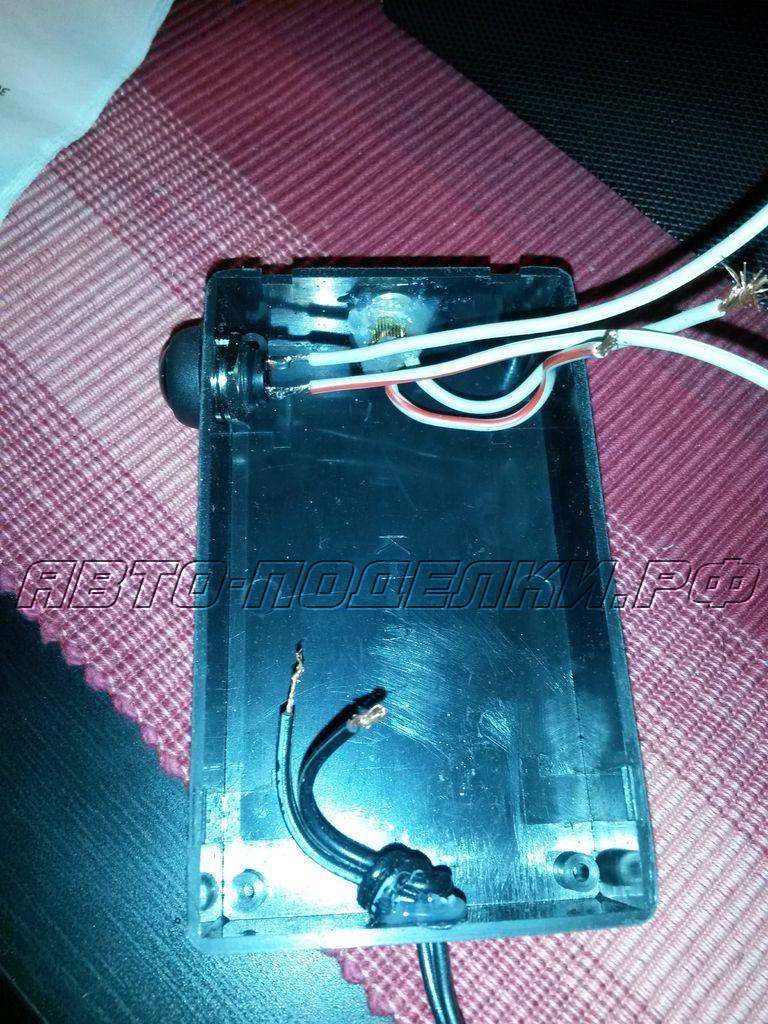 Я решил поставить выключатель на цепи питания преобразователя, так чтобы напряжение подавалось только тогда, когда переключатель нажат. Соедините проводом центральный контакт вилки прикуривателя (это +) к выключателю, а другой контакт выключателя к”+” на плате преобразователя. Провод от отрицательного контакта (наружного) вилки идет прямо на ”-” платы.