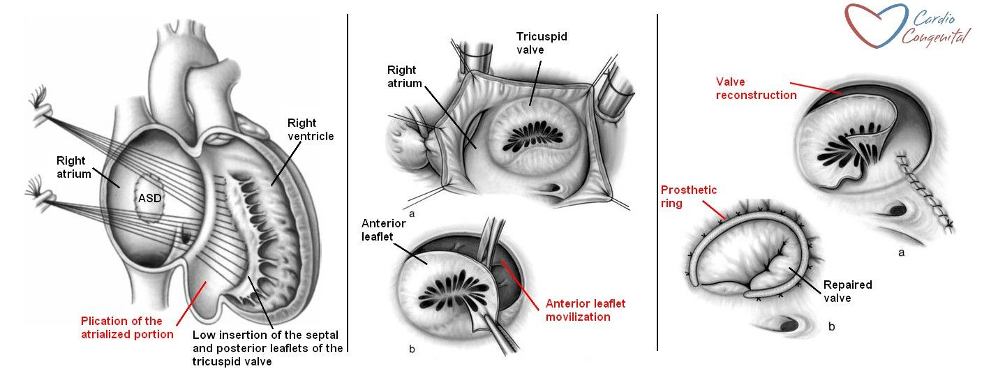 Операцию проводят на открытом сердце, для осуществления возможности ее проведения организовывают процесс искусственного кровообращения. Лишняя часть правого предсердия ушивается, а трехстворчатый клапан швами поднимается до позиции, которая является близкой к нормальной. В случаях когда это невозможно, его убирают и заменяют протезом. Это позволяет забыть о том, что у пациента была аномалия Эбштейна. У взрослых пациентов возможно проведение протезирования, а вот детям младше 15 лет делают пластику клапана.