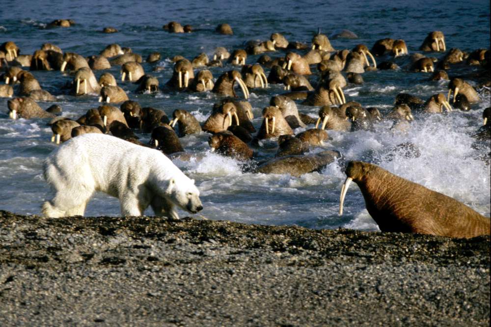 На самом севере России, где Чукотское море встречает Северный Ледовитый океан, расположились угрюмые и гористые острова Врангеля (7,6 тыс. км²) и Геральд (11 км²). В суровых условиях, где бурная жизнь кажется невозможной, есть сотни видов растений — больше, чем на любом другом арктическом острове. Среди чернеющих скал моржи обосновались на крупнейшем в Арктике лежбище, а тысячи птиц устроили гнездовья. Серые киты проплывают в здешних водах во время миграций. Остров Врагнеля называют «роддомом белых медведей» — так много здесь его родовых берлог. А на чукотском он так и называется — Умкилир — «остров белых медведей».
