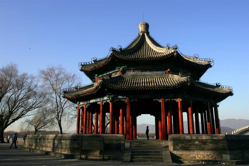 6) Туристы прогуливаются у павильона Бафанг в Летнем дворце, знаменитом классическом имперском саду в Пекине. Летний дворец, построенный в 1750 году был разрушен в 1860 году и восстановлен в 1886 году. Он был включен в Список всемирного наследия в 1998 году. (China Photos/Getty Images)