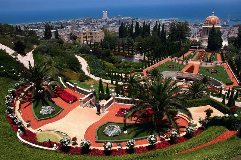 11)Террасированные сады в северном израильском городе Хайфа окружают златоглавую Усыпальницу Баба, основателя веры бахаи. Тут расположен всемирный административный и духовный центр религии бахаи, число исповедующих которую во всем мире менее шести миллионов. Это место было объявлено объектом мирового наследия ЮНЕСКО 8 июля 2008. (David Silverman/Getty Images)