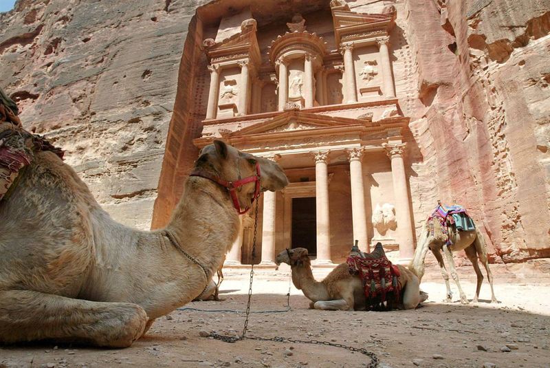 14) Верблюды отдыхают в древнем городе Петра перед главным памятником Иордании, Аль-Хазне или казначейством, предположительно представляющем собой гробницу набатейского царя, вырезанную из песчаника. Этот город, расположенный между Красным и Мертвым морями, находится на пересечении путей из Аравии, Египта, Сирии и Финикии. Петра внесена в список всемирного наследия в 1985 году. (Thomas Coex/AFP — Getty Images)