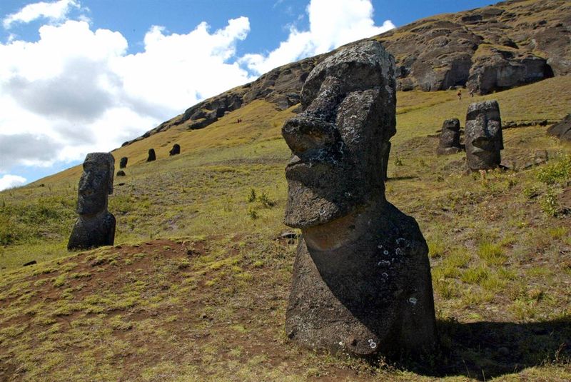 19) Некоторые из 390 брошенных огромных статуй из спрессованного вулканического пепла (моаи на языке рапа-нуи) у подножия вулкана Рано Рараку на острове Пасхи, в 3700 км от побережья Чили. Национальный парк Рапа-Нуи включен в программу Всемирного наследия ЮНЕСКО с 1995 года. (Martin Bernetti/AFP — Getty Images)