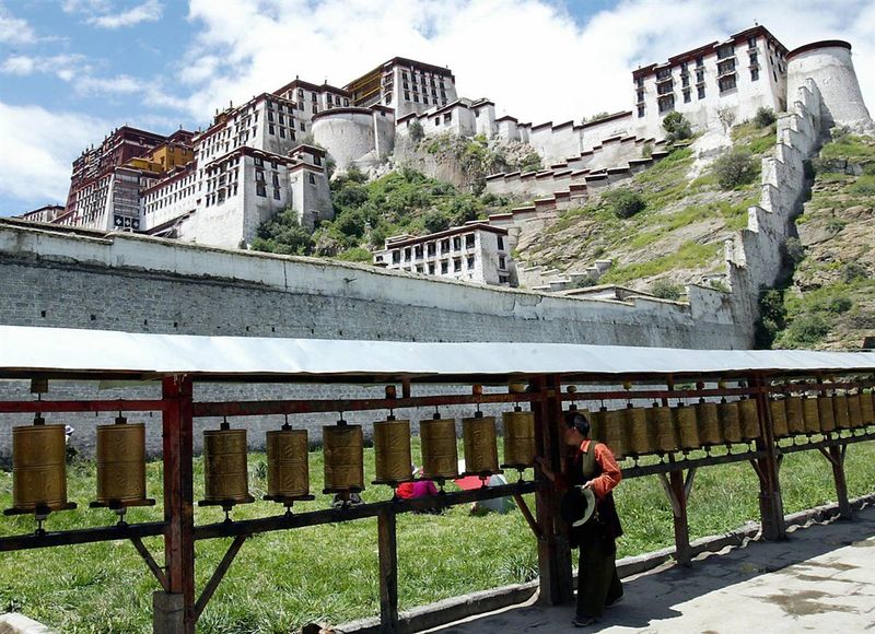 22) Тибетский паломник вращает молитвенные мельницы на территории дворца Потала в столице Тибета Лхасе. Дворец Потала – это царский дворец и буддийский храмовый комплекс, который был основной резиденцией Далай-Ламы. Cегодня дворец Потала является музеем, активно посещаемым туристами, оставаясь местом паломничества буддистов и продолжая использоваться в буддийских ритуалах. Ввиду огромной культурной, религиозной, художественной и исторической значимости, внесён в 1994 году в список Всемирного наследия ЮНЕСКО. (Goh Chai Hin/AFP — Getty Images)
