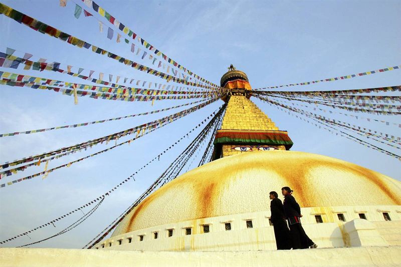 25) Тибетские женщины ходят вокруг Ступы Бодхнатх в Катманду — одной из самых древних и почитаемых буддийских святынь. На гранях венчающей его башни изображены «глаза Будды», инкрустированные слоновой костью. Долина Катманду высотой около 1300 м — горная долина и историческая область Непала. Тут имеется множество буддистских и индуистских храмов от ступы Боднатх до крохотных уличных алтарей в стенах домов. Местные жители говорят что в Долине Катманду живёт 10 миллионов Богов. Долина Катманду была внесена в Список всемирного наследия в 1979 году. (Paula Bronstein/Getty Images)
