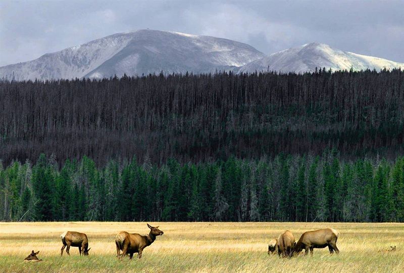 28) Стадо лосей пасется на лугах Йеллоустонского национального парка. На фоне видна гора Холмс, слева, и гора Доум. В Йеллоустонском национальном парке, который занимает почти 900 тыс. гектар, находится более 10 тысяч гейзеров и термальных источников. Парк был включен в программу Всемирного наследия в 1978 году. (Kevork Djansezian/AP)